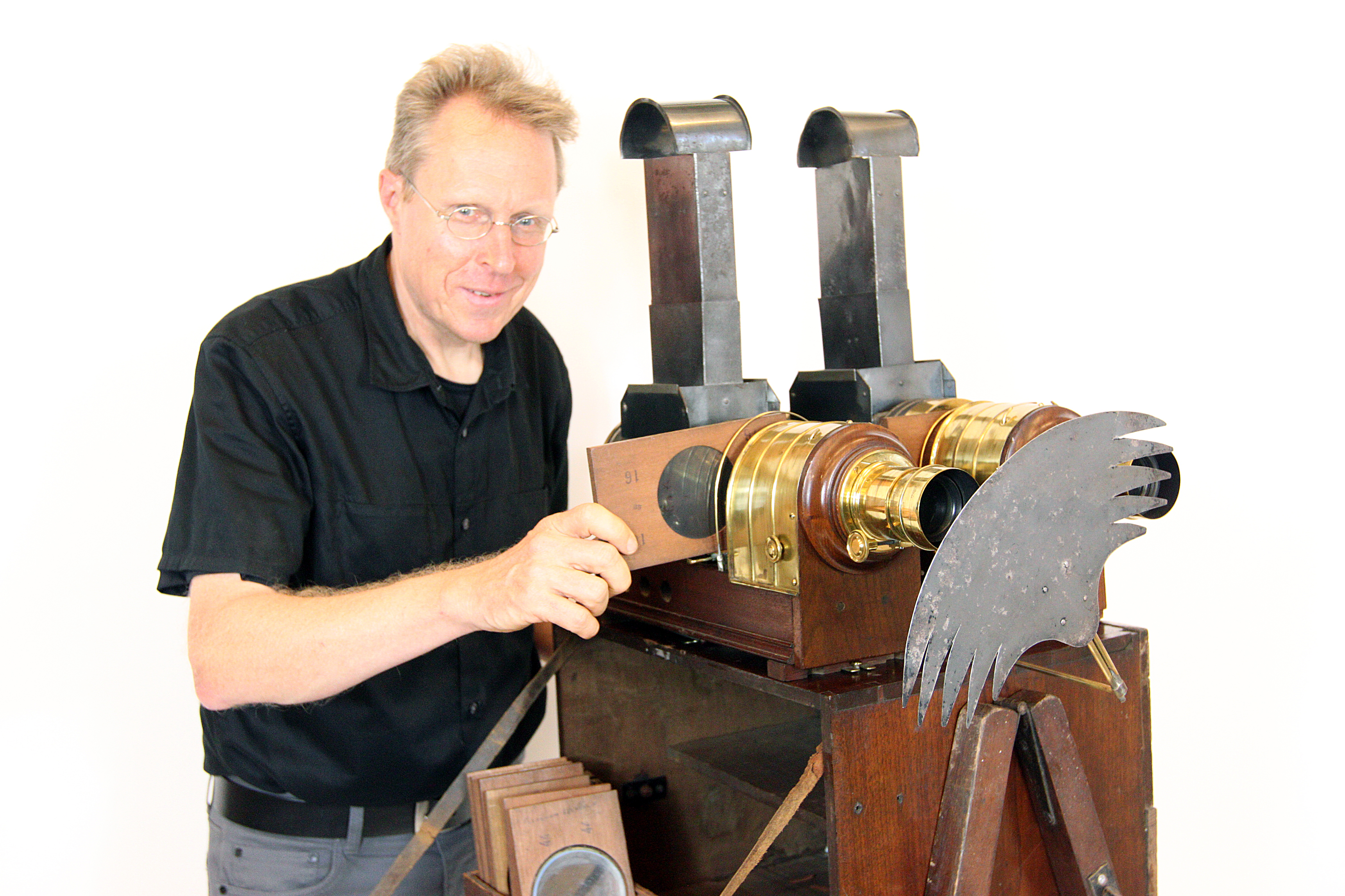 Erkki Huhtamo with his L. J. Marcy dissolving magic lantern pair (Philadelphia, c. 1870). Photo: David Leonard. Copyright free.